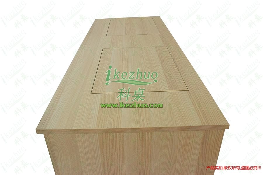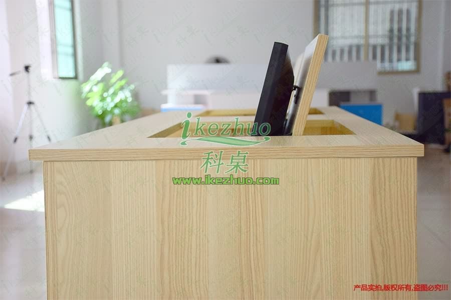 當需要使用顯示器時輕按前端桌面板隱藏在桌子內部的顯示器會自動從桌子下面升到桌面翻轉到合適角度。當不使用顯示器時,可手動按下顯示器翻蓋面板至桌面平整,顯示器自動鎖住隱藏在桌子內與桌面保持平整一致。起到防塵,防盜,保持桌面平整美觀。使用方便,手動控制,翻轉自如。