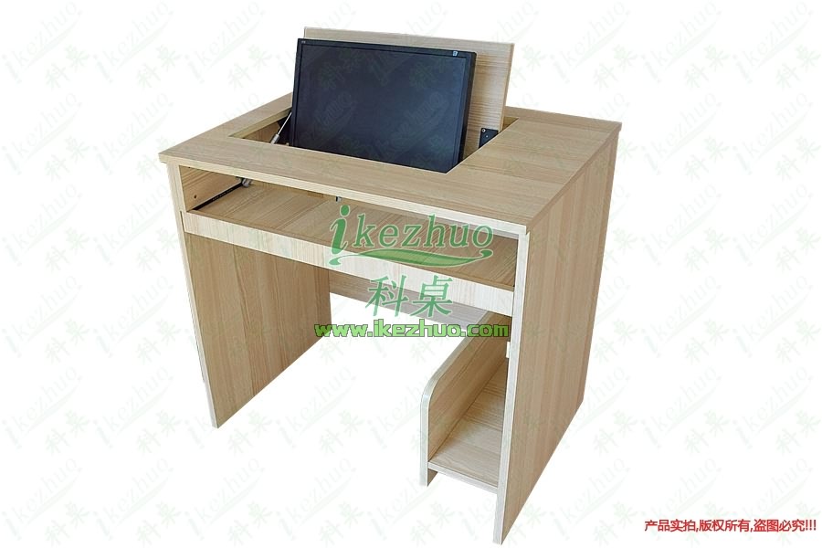 當需要使用顯示器時輕按前端桌面板隱藏在桌子內部的顯示器會自動從桌子下面升到桌面翻轉到合適角度。當不使用顯示器時,可手動按下顯示器翻蓋面板至桌面平整,顯示器自動鎖住隱藏在桌子內與桌面保持平整一致。起到防塵,防盜,保持桌面平整美觀。使用方便,手動控制,翻轉自如。
